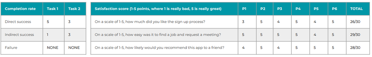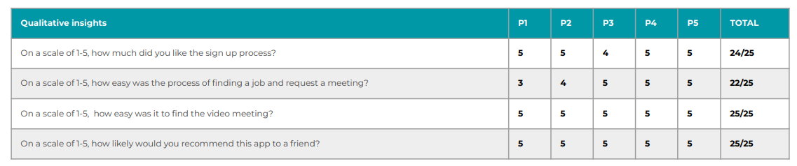 Our goal was to collect both quantitative and qualitative feedback. In this table you can see our quantitative data and if you click on the link, it will take you to affinity mapping, where the qualitative findings with insights and the recommendations for our next step are.