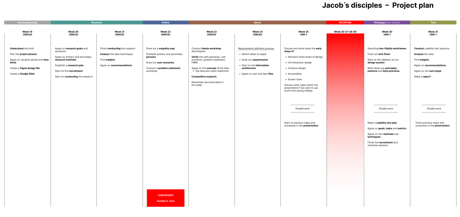 We discussed the project plan quite thoroughly, discussed the criteria and distributed the weeks to see if our milestones in every design thinking phase were possible. By doing this as a collaboration exercise, we managed to discuss potential rabbit holes or challenges and engage every one of us to understand small and significant goals and what this project will demand from us as a team.