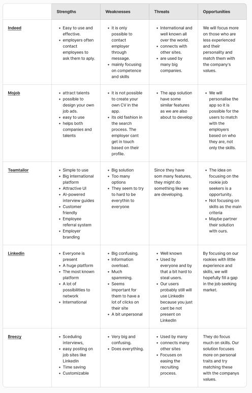 Our most exciting finding by executing the SWOT analysis was that several solutions are extensive and confusing. They wish to meet all sorts of needs and manage many different functionality. Another aspect was the focus on skills and competence, which is the opposite direction our solution will go.